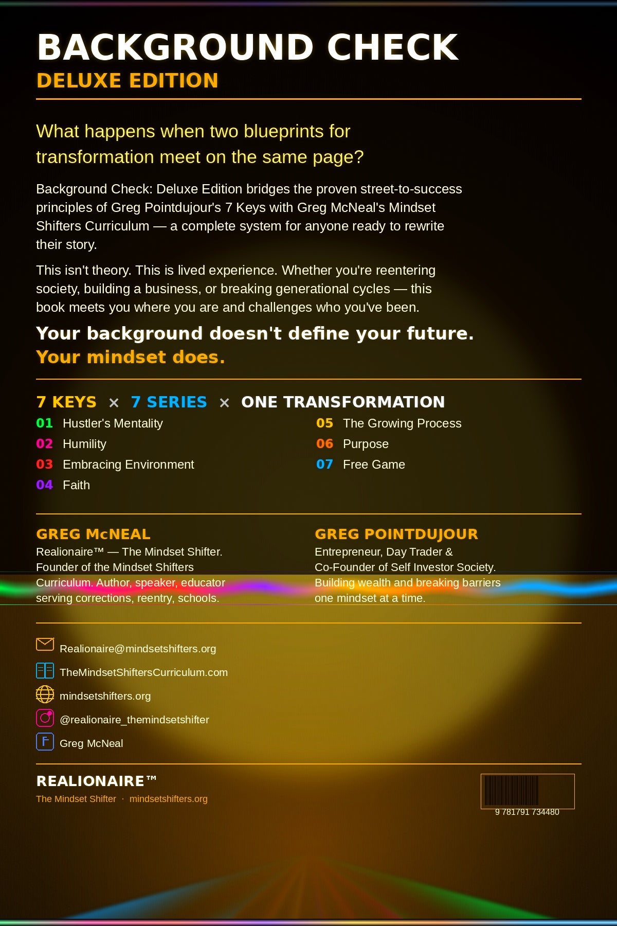 Background Check: Deluxe Edition bridges the proven street-to-success principles of Greg Pointujour's 7 Keys with Greg McNeal's Mindset Shifters Curriculum - a complete system for anyone ready to rewrite their story.